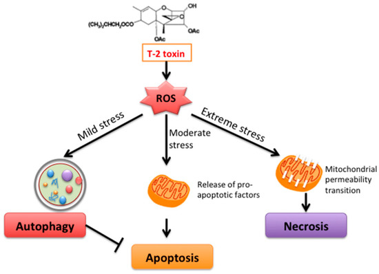Schematic illustration of T-2 toxin-induced autophagy and apoptosis. Under mild stress, liver cells activate the mechanism of autophagy to protect the cells from the stress-induced damage and at same time suppress apoptosis. When the stress levels increase, the apoptosis pathway is activated. Under severe stress conditions, outright necrosis will begin, leading to destruction of tissues.