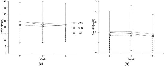 During HDF, plasma concentrations of total IS decreased from baseline (t0, 18.9 ± 13.0 mg/L) to week 3 (t3, 16.6 ± 12.1 mg/L, p = 0.027) (refer to Figure 1a). Total IS levels at t0 and t3 in patients on HDF were lower compared to LFHD (20.8 ± 14.4 mg/L, p = 0.046, and 20.0 ± 12.7 mg/L, p =0.021, resp.), but did not differ from HFHD (20.1 ± 12.6 and 19.3 ± 11.6 mg/L). In contrast, plasma levels of free IS and pCS as well as of total pCS were not different, neither within nor between treatment modes (refer to Figure 1b and Figure 2).