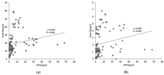 Association of IS plasma concentrations with CRP. Both total and free IS highly correlated with CRP: (a) Total IS vs. CRP; (b) Free IS vs. CRP.