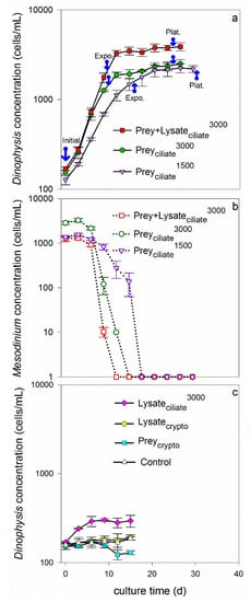 Growth response of Dinophysis acuminata (a,c) and ciliates, M. rubrum (b), in different treatments after being starved, in the light, for two weeks before the experiment to ensure the prey were fully consumed from the medium and that any responses measured in Dinophysis were due to the amendments and not sustained growth or divisions using internal reserves. Treatments include Preyciliate3000: with ciliates at 3000 cells/mL; Prey + Lysateciliate3000: with ciliates at 1500 cells/mL + ciliate lysate equivalent to 1500 cells/mL; Preyciliate1500: with ciliates at 1500 cells/mL (a,b); Lysateciliate3000: with ciliate lysate equivalent to 3000 cells/mL; Lysatecrypto: with cryptophyte lysate equivalent to 15,000 cells/mL; Preycrypto: with cryptophytes at 15,000 cells/mL; and Control: with no prey or lysate addition (c). Initial concentration of D. acuminata was 150 cells/mL for all treatments. Mean values and standard deviations are plotted (n = 3). Blue arrows in (a) indicate when samples were initially harvested for toxin analysis, and then during exponential (Expo.) and plateau (Plat.) growth phases.