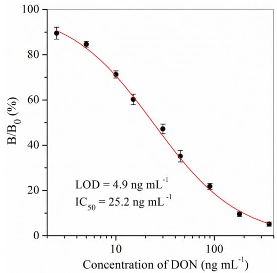 A series of concentrations of DON standards were prepared in working buffer. Triplicate determinations were carried out. The mean values of B/B0, where B is the absorbance value with DON and B0 is the absorbance value in the absence of DON, were plotted against the logarithm of the concentrations of DON standards to obtain the sigmoidal curve using the Origin Program 7.0 software (OriginLab Co., Northampton, MA, USA). The LOD and IC50 were obtained from a four-parameter logistic equation.