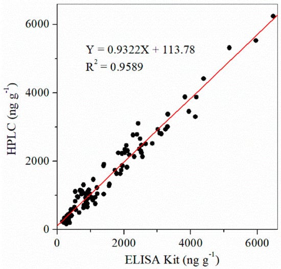 The ELISA kit produced results largely consistent with the standardized HPLC method, and the results are presented in Figure 2. A good correlation of the results of HPLC (Y) and ELISA kit (X) was obtained (Y = 0.9322X + 113.78, R2 = 0.9589), which further indicated that the results of the ELISA kit were reliable.