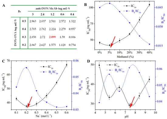 The key parameters of the ELISA kit (concentrations of DON-OVA, anti-DON McAb, and GAM-HRP; content of methanol; concentration of Na+; and pH value) were studied to improve the sensitivity of the ELISA kit. The highest ratio of B0/IC50 and the lowest IC50 were used as the most desirable criteria for the ELISA kit. Other key buffers, compositions, and parameters were adjusted and optimized.