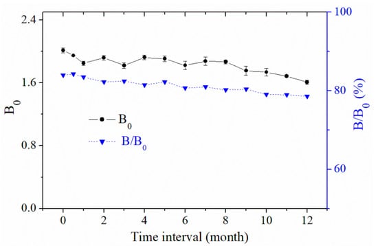 As a biochemical test product, the ELISA kit has some special instructions for its use and storage. Firstly, the ELISA kit must be stored at 2β8 Β°C, the effective service life is 12 months, and the kit must not be frozen. Secondly, the microplates and reagents must be placed at room temperature (20β25 Β°C) for 30 min to ensure better activity and sufficient mixing before use. Microplates cannot be allowed to dry during the testing process. Stability experiments for the ELISA kit were performed and are shown in Figure 4. During storage, the values of B0 and B/B0 (%) showed an acceptable reduction. This indicated that the effective service life of the ELISA kit could be at least 12 months.