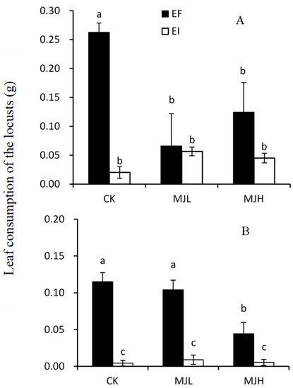 Comparison of the leaf consumption of endophyte-infected (EI) or endophyte-free (EF) Achnatherum sibiricum by the locusts, L. migratoria, in choice (A) and no-choice (B) tests under different MJ (methyl jasmonate) treatments (CK, no MJ control; MJL, low MJ concentration; MJH, high MJ concentration). Different lower-case letters denote means that are significantly different (p < 0.05).