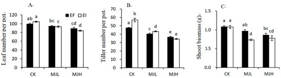 Comparison of leaf number (A), tiller number (B), and shoot biomass (C) of endophyte-free (EF) and endophyte-infected (EI) Achnatherum sibiricum under different MJ (methyl jasmonate) treatments (CK, no MJ control; MJL, low MJ concentration; MJH, high MJ concentration). Different lower-case letters denote means that are significantly different (p < 0.05).