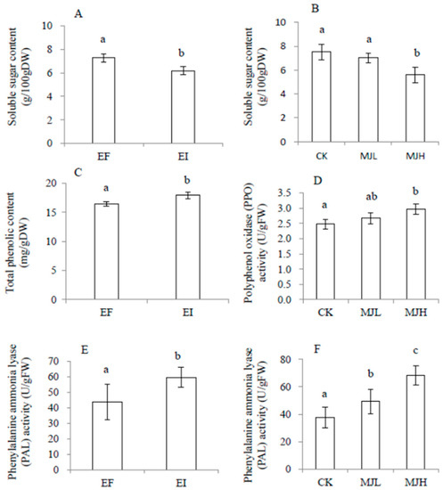 JA is a ubiquitous wound hormone. Repeated wounding of mature leaves induces a rapid increase in endogenous JA concentrations, thus resulting in reduced leaf growth [57]. Exogenous applications of JA or MJ can mimic the temporal and quantitative characteristics of endogenous JA responses [58,59,60,61]. In the present study, MJ treatment inhibited the vegetative growth of both the EI and EF plants, as shown in Table 1 and Figure 2. This is in agreement with other studies that found a reduction in both root growth [62,63] and shoot growth [64,65,66] under exogenous JA treatments. On the contrary, jasmonates might act as negative regulators of plant primary metabolic products, such as sugars [23,67,68,69,70,71] and as positive regulators of plant secondary metabolic products, such as phenolic compounds [72]. In the present study, we also found that MJ treatment decreased soluble sugar content, while it increased the PPO and PAL activities of the treated plants, as shown in Table 2 and Figure 3.