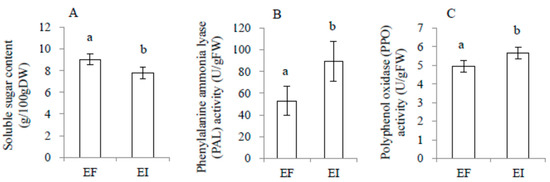 Comparison of soluble sugar content (A), phenylalanine ammonia lyase (PAL, B), and polyphenol oxidase (PPO, C) of endophyte-infected (EI) or endophyte-free (EF) Achnatherum sibiricum with locust feeding. Different lower-case letters denote means that are significantly different (p < 0.05).