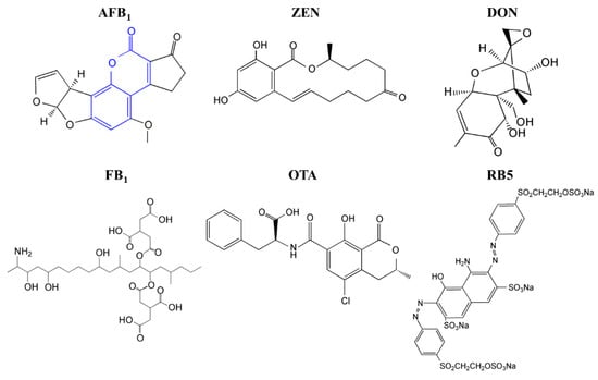 The chemical structures of five major mycotoxins (aflatoxin B1 (AFB1), zearalenone (ZEN), deoxynivalenol (DON) fumonisin B1 (FB1), ocharatoxin A (OTA)) and the synthetic dye RB5. The highlighted part in blue is a coumarin structure, which is a derivative of the lignin monomer p-coumaryl alcohol.