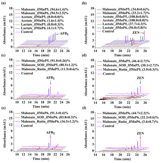 Radicals play an important role in mycotoxin degradation by IlMnP5 and IlMnP6. (a,b) Degradation of AFB1 (a) and ZEN (b) in malonate, lactate, or acetate buffers. (c,d) Effects of SOD and rutin on the degradation of AFB1 (c) and ZEN (d) by IlMnP5. (e,f) Effects of SOD and rutin on degradation of AFB1 (e) and ZEN (f) by IlMnP6. Note that the height of the traces of ZEN degradation was doubled for ease of observation. The degradation percentage was labeled for each enzyme-treated sample, represented as average ± standard deviation.