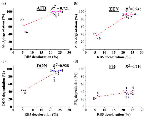 Degradation of four major mycotoxins (AFB1, ZEN, DON, and FB1, 72 h) was positively related to RB5 decolorization (9 h). The enzymes (IlMnP1, IlMnP2, IlMnP4, IlMnP5, IlMnP6, PcMnP1, CsMnP, and NfMnP) are labeled with the numbers 1–8, respectively. (a) Degradation percentages of AFB1 was positively related to RB5 decolorizations by enzymes (R2 = 0.721). (b) Degradation percentages of ZEN was positively related to RB5 decolorizations by enzymes (R2 = 0.945). (c) Degradation percentages of DON was positively related to RB5 decolorizations by enzymes (R2 = 0.928). (d) Degradation percentages of FB1 was positively related to RB5 decolorizations by enzymes (R2 = 0.720).