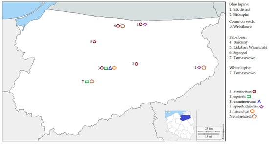 Locations of fields in Warmia-Mazury Province in Poland, from which legume grains were sampled for analyses