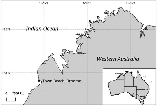Sandy intertidal sediments without discoloration were collected from the surface of the tidal flat during low tide in Town Beach, Broome (17°97’S, 122°23’E) during May 2011 (Figure 1). The first 3–5-cm layer of the sand/silt layer was collected using a flat spoon, as described previously in Murray and Patterson [59]. At the time of collection, the sea surface temperature was 22 °C, and the salinity ranged from 38 to 40. The organisms were isolated according to the Uhlig method [5,60]. In summary, the samples were placed in plastic tubes with their bottom opening sealed with a strained gauze to avoid any larger fauna or debris passing through. A Petri dish was placed under the tube, and frozen seawater was added, creating a temperature and salinity gradient and making the organisms migrate down into the Petri dish. The separated organisms were isolated using a micropipette in local filtered seawater and subsequently enriched with f/2 media at a salinity of 35 [61]: they were observed using a Leica DMIL inverted light microscope (Leica Microsystems GmbH, Wetzlar, Germany).