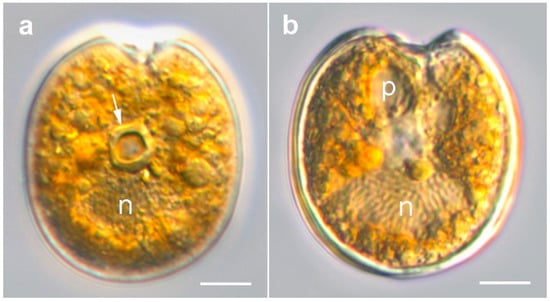 Light micrographs of Prorocentrum concavum BRM1. (a) Right lateral view showing the central pyrenoid (arrow) with a starch sheath (ring-like structure) and the posterior nucleus (n). (b) Mid cell focus: note the pusule (p) and nucleus (n). Scale bars = 10 µM.