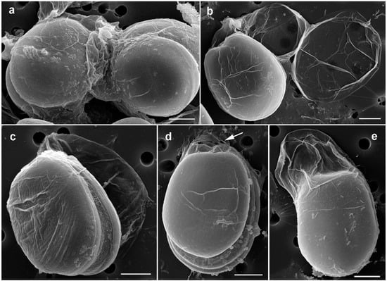 Scanning electron micrographs of Prorocentrum malayense BRM2 showing sheaths around the cells. (a) Several cells sticking together in mucus. (b) Note the empty sheaths. (c) Two cells with sheaths sticking together on top of an empty sheath. (d) Note the irregular mucous stalk-like structures at the apical cell end (arrow). (e) Cell leaving its skin-like sheath. Scale bars = 10 μM.