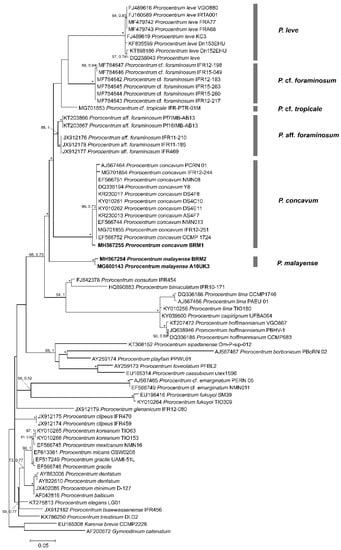 The phylogenetic results for the Prorocentrum strains in the present study are shown in Figure 7. The G+C content of the partial D1–D3 LSU rDNA regions investigated in this study for BRM1 and BRM2 was 50.9% and 51.9%, respectively. Maximum likelihood (ML) and Bayesian inference (BI) analyses performed on the LSU rDNA regions of the two isolates with additional reference sequences from GenBank identified numerous strongly supported clades exhibiting a similar topology to previous studies. The BRM1 strain (Genbank accession number MH567255) was grouped with other P. concavum sequences retrieved from GenBank and was branched at the base of this species subclade. The BRM2 strain (Genbank accession number MH567254), P. malayense, formed a novel fully supported monophyletic lineage (BI = 1.00; ML = 100) at the base of the clade comprising P. foraminosum, P. aff. foraminosum P. concavum, P. cf. tropicale and P. leve (Figure 7). The genetic p distance between the P. concavum isolates, including BRM1, that was used in the phylogenetic analyses varied from 0.0–0.5% (Table 1). However, the p distance values between the closely related species in clade A varied from 12.9–16.4% (Table 1).