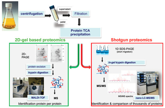 Examples of proteomics-based strategies to decipher the toxigenic profile of a bacterial pathogen. Pathogens are grown in regulated batch cultures that mimic the conditions encountered in the host. Exoproteins are collected by centrifugation of the culture medium and then filtration (0.22 µm) of the resulting supernatant. Exoproteins are precipitated using trichloroacetic acid (TCA) or collected by other methods. In two-dimensional (2D) gel–based proteomics, exoproteins are resolved by 2D gel electrophoresis. Exoproteins of interest are excised from the gels and digested using trypsin. Tryptic peptides are analyzed on a Matrix Assisted Laser Desorption Ionisation-Time of Flight (MALDI-TOF) mass spectrometer. Protein identification relies on the comparison of the measured mass of the tryptic peptides with the predicted masses of tryptic peptides from database protein sequences. This approach is quite time consuming as mass spectrometry measurement should be done on each protein spot. In shotgun proteomics, the whole proteome is collected as a single band from a one-dimensional SDS-Polyacrylamide Gel Electrophoresis (1D SDS-PAGE) gel, which is treated and in-gel proteolyzed with trypsin. Alternatively, the proteins may be in-solution proteolyzed in a gel-free approach. The resulting peptide mixture is injected into a reverse phase chromatography column coupled to a high-resolution mass spectrometer. The recorded tandem mass (MS/MS) spectra are processed against a protein sequence database using a search engine such as Mascot Daemon algorithm (Matrix Science). Exotoxin semi-quantification is simply but reliably evaluated by MS/MS spectral counts.