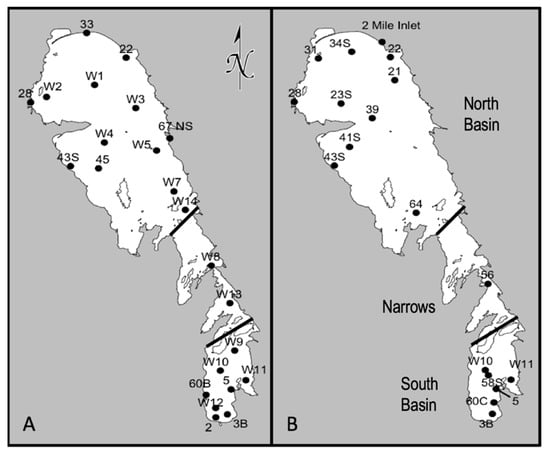 Lake Winnipeg (Manitoba, Canada) is the world’s 10th largest freshwater and the 12th largest lake overall by surface area (24,514 km2). The lake is separated into three distinct regions: a shallow south basin (SB; Zm = 9 m), with high turbidity from runoff from the Red River and sediment resuspension [], the Narrows, where restricted flow results in sediment deposition, and a larger and deeper north basin (NB) with clearer water (>80% total surface area, Zm = 13.3 m). Of the two primary tributaries, the Red and Winnipeg Rivers, the Red River flows through extensive agricultural lands before entering the SB of the lake [,]. The watershed spans nearly 1 million km2 and encompasses four provinces and two U.S. states []. The lake generates significant revenue including major contributions to Manitoba’s $30 million/year fishing, $100 million/year tourism, and >$350 million/year hydroelectric industries [,].