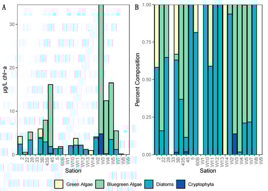 Total chlorophyll-a concentration (A) and % phylum composition (B) from flouroprobe analysis at summer sites in Lake Winnipeg. Sampling depths for flouroprobe data was approximately 1 m from the water surface.