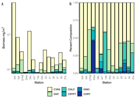 Total biomass (A) and % phylum composition (B) for eight summer sites and six fall sites in Lake Winnipeg. The dominant taxa in 11 of the 14 sites was cyanobacteria, consisting primarily of Aphanizomenon flos-aquae complex and Dolichospermum spp. The eight summer sites were W3, W5, 67NS, 23es, 34s, s21, 13b, and 43a. The six fall sites were 22, 21, 28, 31, 39, and 37s. Abbreviations for taxa are cyanobacteria (CYAN), diatoms (DIAT), chlorophytes (CHLO), cryptophytes (CRYPT), dinoflagellates (DINO), and chrysophytes (CHRY).