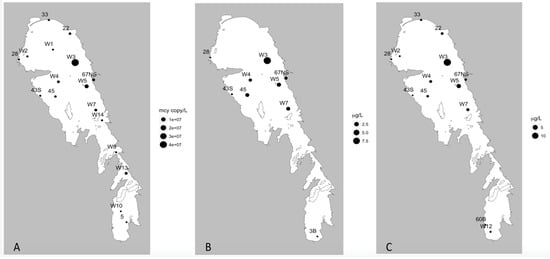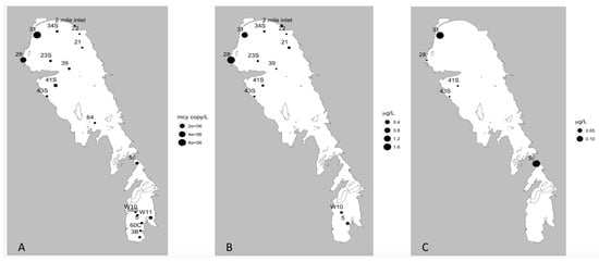 Toxic and non-toxic (i.e., not genetically capable of producing known cyanotoxins) strains of the same species often co-occur in the same bloom but are indistinguishable using traditional identification and enumeration techniques []. Therefore, the development of molecular techniques has become an invaluable tool, allowing a far greater capacity to resolve questions about taxa and toxicity. In the early 2000s many molecular targets were used to detect toxin-producing genes in water samples with a theoretical detection limit of a single gene copy, even when no toxin was detectable at the time of sampling [,,,]. Further development of these methods has allowed the detection and quantification of genes for multiple toxins from a sample using a single assay []. The multiplex qPCR method described by Al-Tebrineh et al. [] can simultaneously identify certain genes within the gene clusters mcy, cyr, and sxt responsible for the production of MCs, cylindrospermopsins (CYNs), and saxitoxins (STXs), respectively. This approach allows a more detailed assessment of the genetic potential for toxin production than more traditional single-gene assays, and coupled with other measures, provides insight into the presence and expression of toxin-producing genes within a planktonic community.