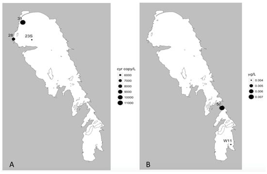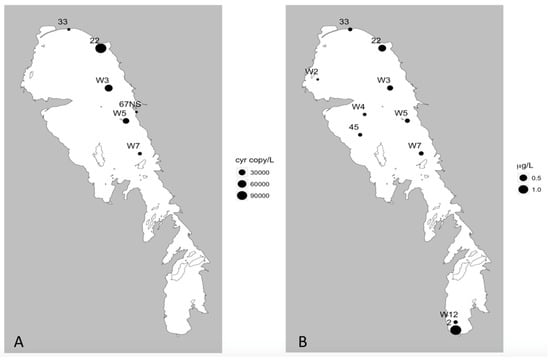 Presence of cyrA genes and cylindrospermopsin concentrations from the summer 2013 season. (A) CyrA gene concentration (gene copy/L) and (B) cylindrospermopsin concentration via MC-MRM analysis (μg/L).