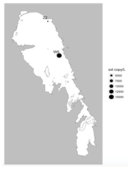SxtA gene concentration (μg/L) from the summer 2013 season.