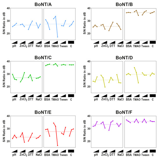 Many diagnostic assays for the detection of botulinum neurotoxins rely on the enzymatic cleavage of their cognate substrate. To achieve maximum sensitivity in the detection of these highly potent toxins, there is a common need for the optimization of catalytic efficiency. As most assays are developed to simultaneously detect single or few different serotypes, no extensive comparison of the requirements regarding buffer composition and additives has been done so far. Optimization following the classical “one-factor-at-a-time” approach offers the advantage of covering all possible combinations, thereby determining optimal conditions independent of mutual interactions between different factors [68]. However, this strategy is time-consuming and tedious and, therefore, not easily applicable for a comprehensive analysis of a large number of test factors and levels. On the contrary, the Taguchi DoE method offers the advantage of testing multiple factors at several levels in a factorial design using pre-existing orthogonal arrays, thereby greatly reducing the number of experiments necessary for assay optimization. Despite its many advantages compared to full factorial experiments, the Taguchi DoE method is still barely used in the life sciences. However, by applying this method, significant improvements can be gained in a shorter amount of time while the statistical analysis dissects influence from negligible factors.