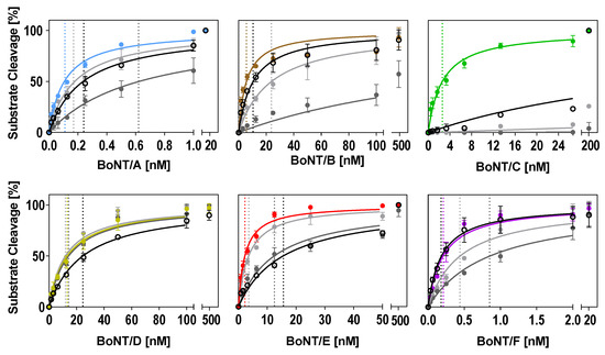 Finally, to test if the cleavage efficiency for BoNT serotypes A–F was enhanced after both optimization processes, substrate cleavage was tested against different buffers. Therefore, the dilution series of BoNTs were incubated with SNAP-25 or VAMP-2 in the respective optimized buffers (Table 2). For comparison, two previously described buffers containing either 50 mM HEPES, 20 µM ZnCl2, 5 mM DTT, 1 mg/mL BSA, 0.5% Tween 20 at pH 7 (termed the Jones buffer [45]) or 50 mM HEPES, 20 µM ZnCl2, 1 mM DTT, 1 % BSA at pH 7 (termed the Evans buffer [67]) were tested in parallel. The amount of cleavage was determined as described above, and values were plotted vs. increasing BoNT concentrations using Michaelis–Menten kinetics, assuming a Km > 0 and Vmax of 100.