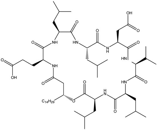 - Peypoux, F.; Bonmatin, J.M.; Labbe, H.; Grangemard, I.; Das, B.C.; Ptak, M.; Wallach, J.; Michel, G. [Ala4] surfactin, a novel isoform from Bacillus subtilis studied by mass and NMR spectroscopies. Eur. J. Biochem. 1994, 224, 89–96. [Google Scholar] [CrossRef]
