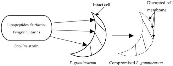 The antagonism of these antimicrobial substances has been reported against F. graminearum [26,27], Fusarium oxysporum [39,40], Fusarium solani, and Rhizoctonia solani [40], amongst many other plant pathogenic fungi. In a study by Földes and colleagues [29], antagonistic compounds produced by Bacillus subtilis IFS-01 exhibited antimicrobial effects against phytopathogenic, food-borne, and spoilage microorganisms. In an agar diffusion assay, some of the filamentous fungi and yeasts tested showed no visible growth within the inhibition zone (about 10 mm from the colony) due to the antagonistic effect of B. subtilis IFS-01. These findings confirmed the biological control ability of this Bacillus strain against these fungi and yeasts. The iturin family of the lipopeptides produced by Bacillus amyloliquefaciens PPCB044 strain showed antagonism against pathogenic fungi from seven citrus plants during postharvest [41]. All the fungal pathogens were deterred by the B. amyloliquefaciens PPCB004 strain, as the strain produced compounds related to iturin A, fengycin, and surfactin [41]. Similar results were also described by Gong et al. [26], who reported the antagonism of iturin A and plipastatin A from B. amyloliquefaciens S76-3 in wheat inoculated with F. graminearum. The data obtained from both the growth chamber and the field plot assays revealed a strong antagonistic activity of strain S76-3 against the growth and development of F. graminearum. Iturin A killed the conidia at the minimal inhibitory concentration of 50 µg/mL, while plipastatin A exhibited a strong fungal activity at 100 µg/mL.