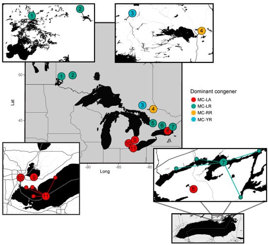 Map of main water bodies with raw water intake samples analyzed by the OMECP. Points are colour coded by dominant congener as determined by an indicator analysis (indval function from the {labdsv} package in R), which showed that Robin Lake (8), Lake St. Clair (9), Detroit River (10) and Lake Erie (11) were dominated by MC-LA (red), Lake of the Woods (1), Lake Wabigoon (2), Lake Couchiching (5), the Otonabee River (6), and Lake Ontario’s Bay of Quinte (7) were dominated by MC-LR (green), Ramsey Lake (3) was dominated by MC-YR (blue), and Lake Nipissing (4) by MC-RR (orange). Note: There are four intake sites located along Lake Erie (Elgin, Essex, Union, and Pelee island), four along the Bay of Quinte (Bayside, Belleville, Deseronto, and Picton) and two along Lake St. Clair (Lakeshore and Stoney Point). All other main water bodies only have one intake site.