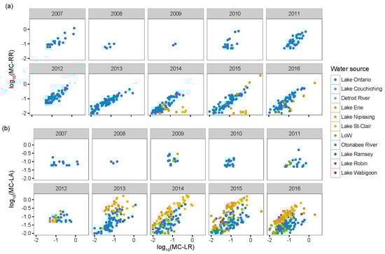 Relationships between dominant congeners from the Laurentian Great Lakes basin raw water intake data. Log-transformed concentrations of (a) MC-RR and (b) MC-LA vs. MC-LR.