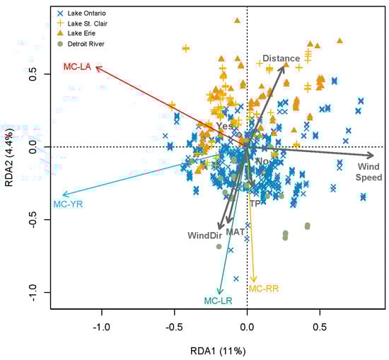 Redundancy analysis of the relationships between the relative abundance of microcystin congeners (i.e., MCL-A, -LR, -RR, and -YR) and environmental factors (i.e., meteorological conditions, nutrient concentrations, intake location, and chlorine treatment) from the most frequently sampled water bodies of the Laurentian Great Lakes basin raw water intake data. Quantitative environmental factors were scaled and centered to reduce variance prior to analysis. The centroids of the qualitative variable (categorical variable for chlorine treatment, Yes/No) are shown by the grey diamonds.