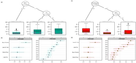 Mixed effect regression tree analysis for MC-LR and MC-LA concentrations from the most frequently sampled water bodies of the Laurentian Great Lakes basin, where fixed effects relationships are shown in (a,c) and random intercept coefficients are shown in (b,d) for MC-LR and -LA, respectively. MAT = monthly averaged maximum air temperature (°C), TP = Total Phosphorus (µg/L), and WindSpeed = monthly averaged maximum wind speed (km/hr).