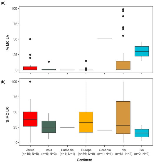 Summary of global meta-analysis of the peer-reviewed literature (OMECP raw intake sites were omitted). Boxplot of the percentage of (a) MC-LA and (b) MC-LR in different continents, where n = number of lakes and N = number of countries in each continent.