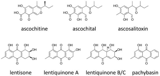Anthraquinones are produced by many different fungi and plants, but the pathways of their biosynthesis are different: Fungal anthraquinones are primarily synthesized via the polyketide pathway, while plant anthraquinones are synthesized via either the polyketide or the shikimate pathway [32,33]. Many anthraquinones that have been isolated from dothideomycetes fungi have been reported as phytotoxins and play diverse roles, such as UV protection, antibiosis, signaling, and redox reactions [34,35,36,37,38,39]. Nevertheless, their roles in pathogenicity have not yet been clearly demonstrated. Anthraquinones are among the largest groups of natural products, but only A. lentis is known to produce anthraquinones in the legume-associated Ascochyta species [40,41]. Although A. lentis is phylogenetically closely related to ascochitine producers, such as A. fabae, A. pisi and A. viciae-villosae [9], ascochitine has not been found in culture extracts of A. lentis isolates [16], suggesting the metabolic profiles of A. lentis have been diversified from the related species. Among diverse anthraquinones produced by A. lentis, lentiquinones, lentisone and pachybasin exhibited significant biological activities (Figure 1).