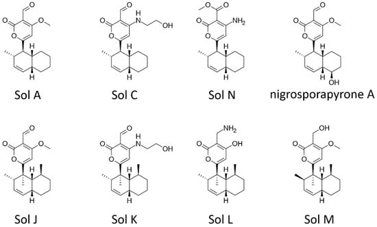 Solanapyrone congeners produced by Ascochyta rabiei and natural analogs found in other fungal extracts. Sol: Solanapyrone.