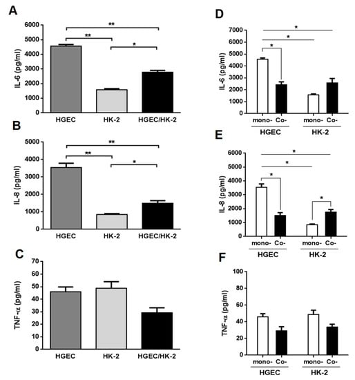 Cytokines secreted under basal conditions by HGEC and HK-2 monocultures and HGEC/HK-2 co-cultures. Basal levels of IL-6 (A), IL-8 (B) and TNF-α (C) secreted in supernatants of HGEC and HK-2 monocultures or in total supernatant of HGEC/HK-2 co-cultures were quantified by ELISA. Comparison are shown between IL-6 (D), IL-8 (E) and TNF-α (F) levels secreted by monocultures (mono-) of HGEC or HK-2 and HGEC or HK-2 co-culture compartments (Co-). Results are expressed as mean ± SEM of four experiments. HGEC vs. HK-2 vs. HGEC/HK-2 and HGEC or HK-2 co- vs. HGEC or HK-2 mono-, (n = 4). * p < 0.05, ** p < 0.01.