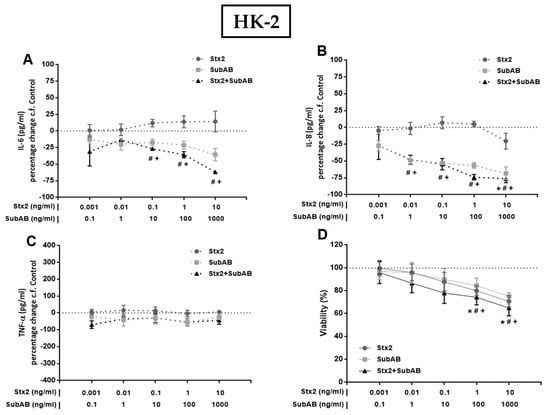 Effects of Stx2, SubAB and Stx2+SubAB on cytokine secretion and cell viability of HK-2 monocultures. HK-2 monocultures were treated to different concentrations of Stx2, SubAB and Stx2+SubAB for 24 h and IL-6 (A), IL-8 (B) and TNF-α (C) were quantified by ELISA. Results are expressed as the percentage (%) change in pg/mL relative to basal cytokine levels (control) (percentage change c.f Control). In addition, cell viability was analyzed by neutral red uptake (D). Absorbance was read at 540 nm and 100% was considered the viability of cells incubated under the same conditions but without toxin treatment (control). Results are expressed as mean ± SEM of three experiments. Ctrl vs. *Stx2, #SubAB or +Stx2+SubAB. p < 0.05.