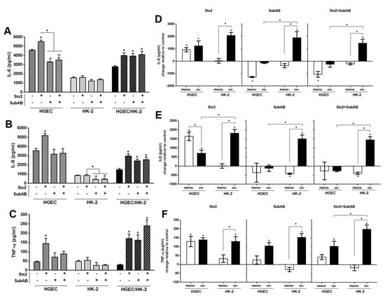 Differential effects on IL-6, IL-8 and TNF-α secretion by monocultures and co-cultures exposed to Stx2, SubAB and Stx2+SubAB. HGEC, HK-2 monocultures and HGEC/HK-2 co-cultures were exposed to Stx2 (0.01 ng/mL), SubAB (1 ng/mL) or Stx2+SubAB (0.01 ng/mL + 1 ng/mL) for 24 h. IL-6 (A), IL-8 (B) and TNF-α (C) secreted in supernatants of HGEC and HK-2 monocultures or in total supernatant of HGEC/HK-2 co-cultures were quantified by ELISA. Comparison between IL-6 (D), IL-8 (E) and TNF-α (F) levels secreted by monocultures (mono-) of HGEC or HK-2 and HGEC or HK-2 co-culture compartments (Co-). Results are expressed as mean ± SEM of four experiments. HGEC vs. HK-2 vs. HGEC/HK-2 and HGEC or HK-2 co- vs. HGEC or HK-2 mono-, (n = 4). * p < 0.05.