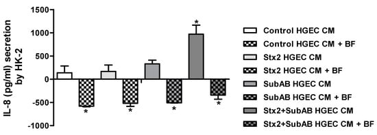 Taking into account the results obtained regarding the differential secretion of cytokines induced by toxins in the HK-2 co-culture compartment compared to HK-2 monocultures, we hypothesize that soluble factors secreted by HGEC in the co-culture could stimulate the secretion of IL-6, IL-8 and TNF-α by HK-2. As shown in Figure 5, the conditioned medium (CM) derived from HGEC control, Stx2, SubAB and Stx2+SubAB treatments were able to augment the secretion of IL-8 by HK-2 monocultures. In addition, a significant increase was observed when cells were stimulated with CM from HGEC treated with Stx2+SubAB relative to CM of control HGEC. Furthermore, when Brefeldin A (BF) was incorporated to HK-2 monocultures after the addition of HGEC CM, a blockage of IL-8 secretion by HK-2 monocultures was obtained for all treatments (Figure 5). On the contrary, we did not observe any modulation for IL-6 and TNF-α secretion (data not shown).