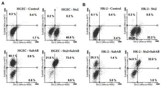 Internalization of Stx2, SubAB or both toxins by HGEC and HK-2 in co-culture. HGEC/HK-2 co-cultures were exposed or not to Stx2 (0.01 ng/mL), SubAB (1 ng/mL) or Stx2+SubAB (0.01 ng/mL +1 ng/mL) for 24 h. Then HGEC and HK-2 cells were removed from the cell culture inserts and the presence of Stx2, SubAB and Stx2+SubAB were evaluated by HGEC and HK-2 intracellular staining and flow cytometry analysis. Stx2 was detected by a mouse anti-Stx2 and then with an anti-mouse Dylight 488-conjugated antibody. SubAB was identified by a rabbit anti-SubAB and then with an anti-rabbit Alexa Fluor 647-conjugated antibody. The results are expressed as the percentage of positive cells for Stx2, SubAB and Stx2+SubAB. Representative dot plots are shown for HGEC (A) and HK-2 (B).