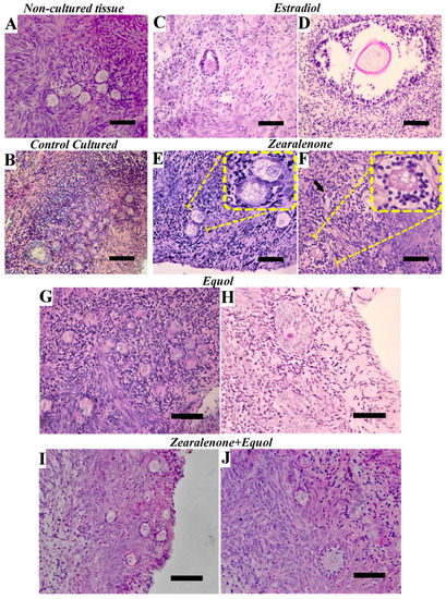 Representative images showing histological aspects of the preantral follicles before culture (A) primordial follicles, and after culture in the absence of xenoestrogens (B) follicles at different developmental stages, or in the presence of 3.12 μmol/L E2 (C,D) secondary follicles, 1 μmol/L ZEN (E) primordial follicles, (F) secondary follicle, 1 μmol/L Equol (G) primordial follicles, (H) secondary follicle), 1 μmol/L ZEN + 1 μmol/L Equol (I) primordial follicles, (J) secondary follicle with a primordial one). In panels E and F, inserts are given to show oocyte vacuolization in primordial and secondary follicles, respectively, after exposure to ZEN. Bar 50 µm. Staining: Haematoxylin-eosin.