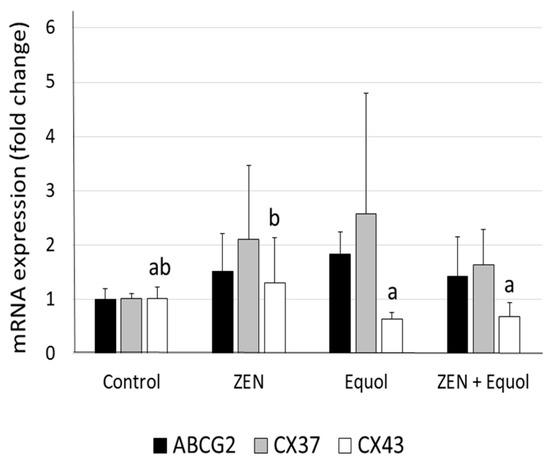 No significant differences were observed in the mRNA expression of ABCG2, CX37, and CX43 when ZEN, equol, or their combinations were compared to the control group. However, a significant decrease in CX43 expression was observed in ovarian tissue exposed to equol or ZEN + equol when compared with the tissues exposed to ZEN only (Figure 2).