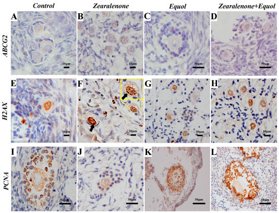 A total of 1609 follicles (921 primordial, 631 primary, and 57 secondary follicles) were investigated, and the results of immunohistochemistry showed that H2AX protein expression significantly increased in primordial follicles exposed to ZEN. No differences were observed between the control and equol groups. Furthermore, when ZEN was combined with equol, H2AX expression remained significantly higher than that observed in primordial follicles from the control group, but significantly lower than the rates of immunolabelled primordial follicles after exposure to ZEN.