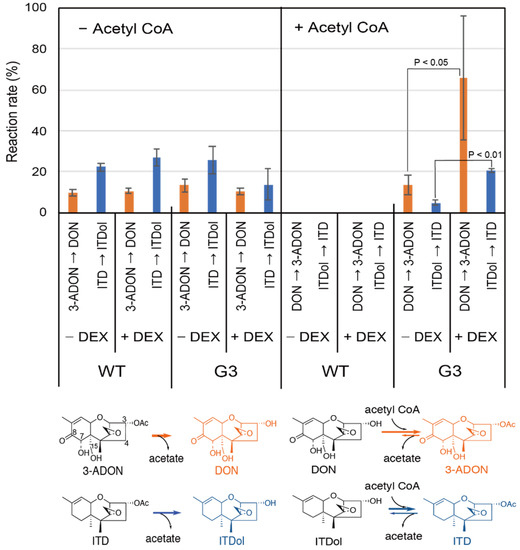 Acetylase and deacetylase activities of crude enzymes from FM3A cells. Wild-type (WT) and the transformant (G3) cells were pretreated with or without DEX (dexamethasone) and the crude enzyme was prepared from the harvested cells. The enzyme reaction was carried out in 200 µL reaction mixture, with (right) or without (left) 1 mM acetyl CoA, and 10 µg of a trichothecene as a substrate; 148 µM 3-ADON (3-acetyldeoxynivalenol), 171 µM ITD (isotrichodermin), 169 µM DON (deoxynivalenol), or 200 µM ITDol (isotrichodermol) at a final concentration. The trichothecene denoted at the root of the arrows represents the substrate, while the trichothecene at the tip of the arrow is the product. The percentage reaction rate (%) represents the initial molar ratio of the product over the added substrate per protein (1.0 mg/mL) in the reaction mixture. The values represent the average ± standard deviation (SD) (n = 3).