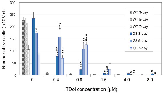 Growth of WT and the transformant G3 cells in B-medium containing ITDol. After pretreatment with DEX, the cells were seeded in 24-well plates, and ITDol solution was added to the cells. On day 3, 5, and 7, the cells were harvested and diluted with trypan blue solution, and the number of the live cells were counted. The values represent the average ± SD (n = 3). The numbers of live cells of G3 which showed statistical differences from those of their corresponding WT are marked with asterisks (* p < 0.05; ** p < 0.01; *** p < 0.001).