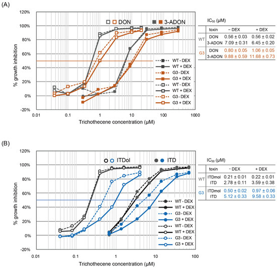For the cytotoxicity evaluation, colorimetric cell viability assays using WST-8 were performed. Each trichothecene was prepared in 50% DMSO as follows: for DON, 0, 0.0034, 0.010, 0.034, 0.10, 0.34, 1.0, or 2.0 mM (0, 0.001, 0.003, 0.01, 0.03, 0.1, 0.3, or 0.6 mg/mL); for 3-ADON, 0, 0.030, 0.089, 0.30, 0.89, 3.0, 8.9, or 30 mM (0, 0.01, 0.03, 0.1, 0.3, 1.0, 3.0, or 10.0 mg/mL); for ITDol, 0, 0.004, 0.008, 0.016, 0.040, 0.080, 0.16, or 0.40 mM (0, 0.001, 0.002, 0.004, 0.01, 0.02, 0.04, or 0.10 mg/mL); for ITD, 0, 0.0068, 0.014, 0.034, 0.068, 0.14, 0.34, 0.68, 1.4, 3.4, or 6.8 mM (0, 0.002, 0.004, 0.01, 0.02, 0.04, 0.1, 0.2, 0.4, 1.0, or 2.0 mg/mL). Wild-type or G3 cells were suspended at a cell density of 5 × 104/mL in B-medium with or without 50 µM DEX and incubated for one day. Into each well of 96-well plates, 99 L of cell suspension was seeded and 1 µL of each trichothecene prepared above or 50% DMSO (vehicle) was added in triplicate. The cells were incubated for 48 h in a CO2 incubator. Into each well, 10 µL of Cell Counting Kit (CCK)-8 solution (Dojindo Molecular Technologies, Inc., Kumamoto, Japan) was added, and the microtiter plate was incubated for 3 h at 37 °C. OD450 was measured using a MultiskanTM FC plate reader (Thermo Fisher Scientific), and growth inhibition (%) caused by each trichothecene was calculated.