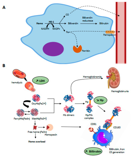 (A) Intracellular metabolism of heme. Heme metabolism is driven by heme-oxygenases (HO-1, inducible and HO-2, constitutive) through a NADPH-dependant addition of an oxygen molecule to the porphyrin ring of heme which catalyses the oxidation of heme and release equimolar quantities of iron, biliverdin, and carbon monoxide (CO). Intra-cytosolic iron will be either stored by ferritin or exported in the plasma through the iron transporter, ferroportin. The billiverdin reductase will reduce billiverdin into billirubin. CO product binds to circulating hemoglobin and is transported as carboxyhemoglobin until it is excreted through ventilation. (B) Scavenging of hemolysis-derived products. Intravascular hemolysis induces release of RBC content including OxyHb(Fe2+) and MetHb(Fe3+). Free Hb is scavenged by hp and the complex captured by CD163 expressed on mature tissue macrophages, promoting its endocytosis. Globin degradation then occurs in lysosomes and the majority of heme is metabolized by HO-1 in cytosol. Hp is rapidly consumed, and free Hb dimers may be filtered into the kidneys, leading to hemoglobinuria. Overload of MetHb leads to the release of free heme, which can be scavenged by Hx. The complex is recognized by CD91 expressed on macrophages. Hb, then heme degradation generate bilirubin, biliverdin, iron, and CO.